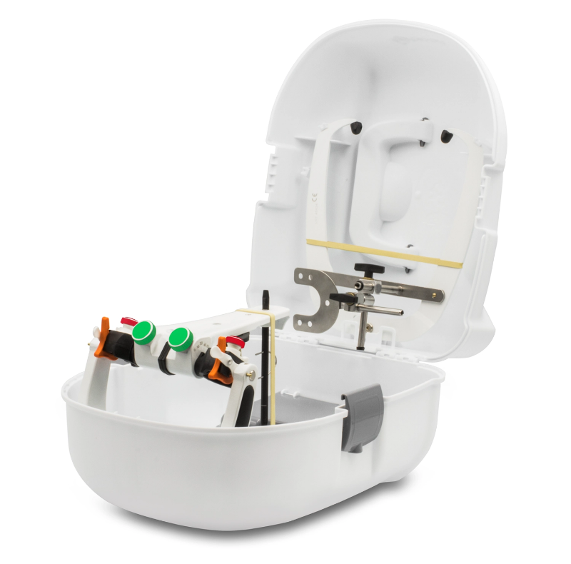 El arco facial registra la posición espacial de la arcada superior del paciente trasladandose al articulador. La transferencia de esta posición con el modelo Standard es fijando el arco facial completo en el articulador. El arco facial estándar posee mariposas de apriete manual, eliminando los inconvenientes causados por el uso de la llave.