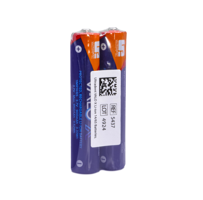 La batería VALO™ X Li-ion 14/65 es una batería recargable de iones de litio de 3,7V y 900mAh, también referida como 1IMR14/65, diseñada para el fotopolimerizador VALO™ X. Esta batería tiene una capacidad de 3,33Wh y está clasificada para más de 500 ciclos de carga/descarga antes de que su capacidad caiga al 70%.