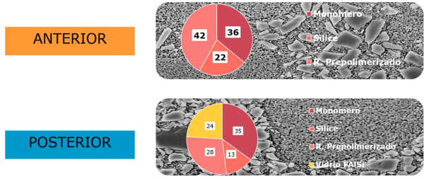 - La incorporación de un alto porcentaje de relleno en volumen basados en una tecnología desplegada por GC brinda una excelente taza de desgaste suerficial, siendo la combinación optima para el sector posterior la formulación de Solare P. Adicionlmente la taza de desgaste de las pizas antagonistas también son menores por las características y distribución del relleno.